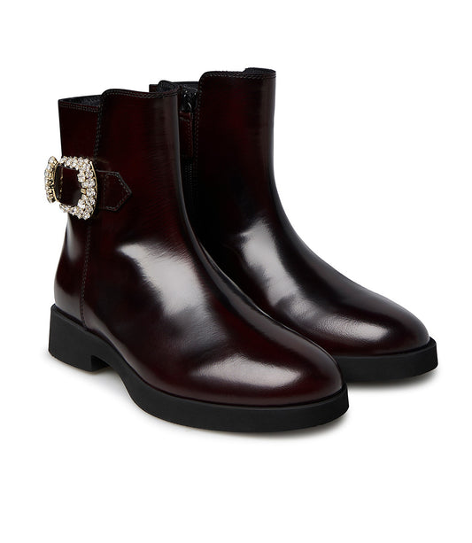 Jeweled buckle burgundy brushed calfskin ankle boots