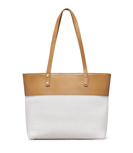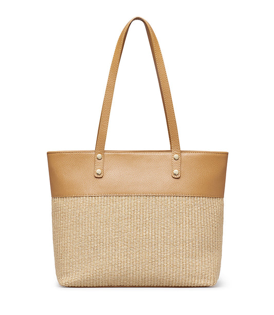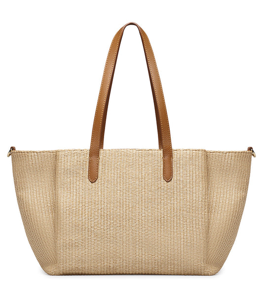 Leather-colored nappa and raffia shopper bag