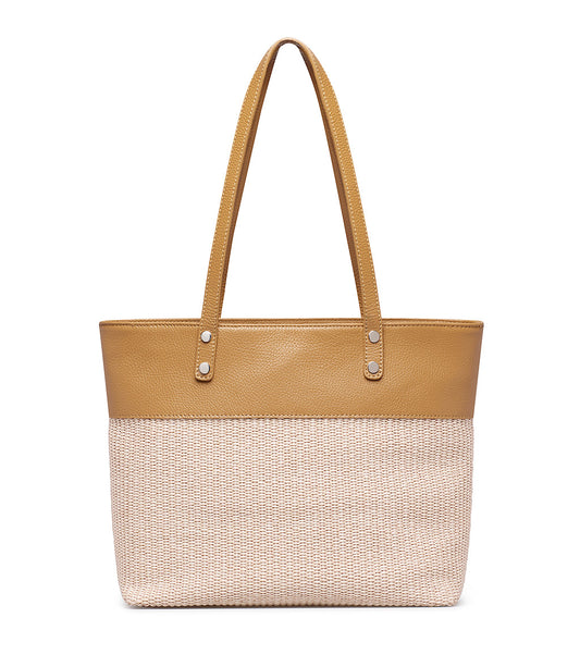 Leather-colored nappa and sand raffia shopper bag