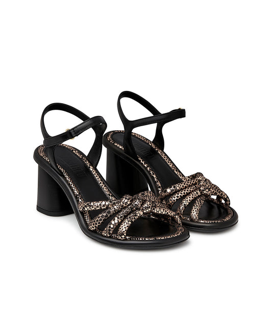 Sandal in black nappa and copper laminated snake print leather