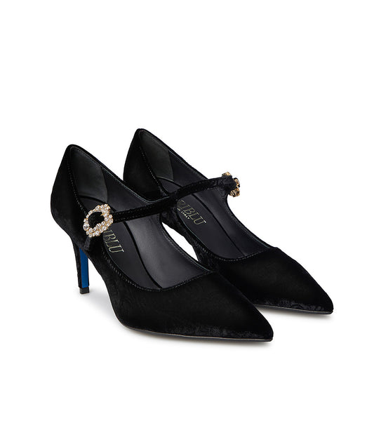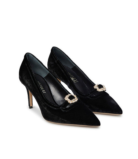 Décolleté in velluto nero con cinturino e fibbia gioiello