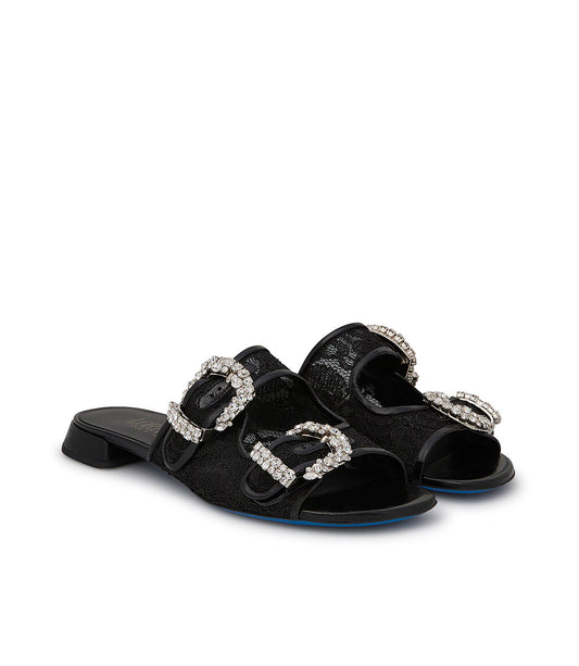 Mules in pizzo e pelle lucida nero con fibbie gioiello