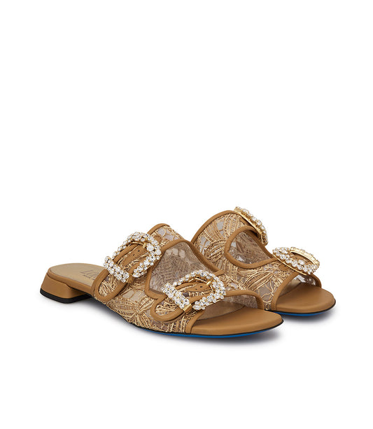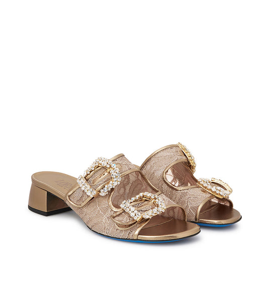 Mules in pizzo e nappa oro con fibbie gioiello