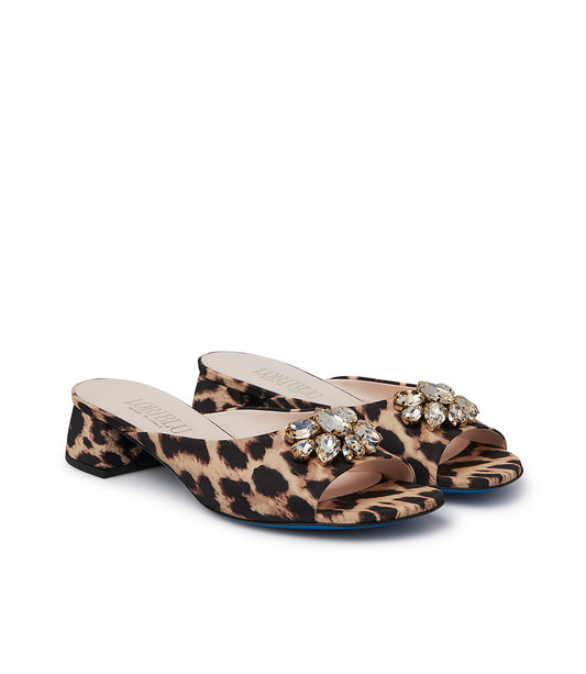 Mules in tessuto stampa leopard con pietre incastonate