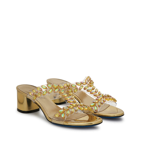 Mules in pelle specchio oro e plexy con pietre