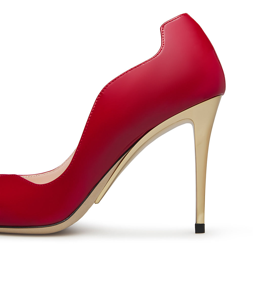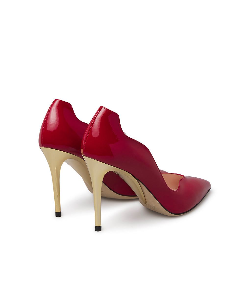 Décolletè in vernice rosso con tacco scultura in metallo oro