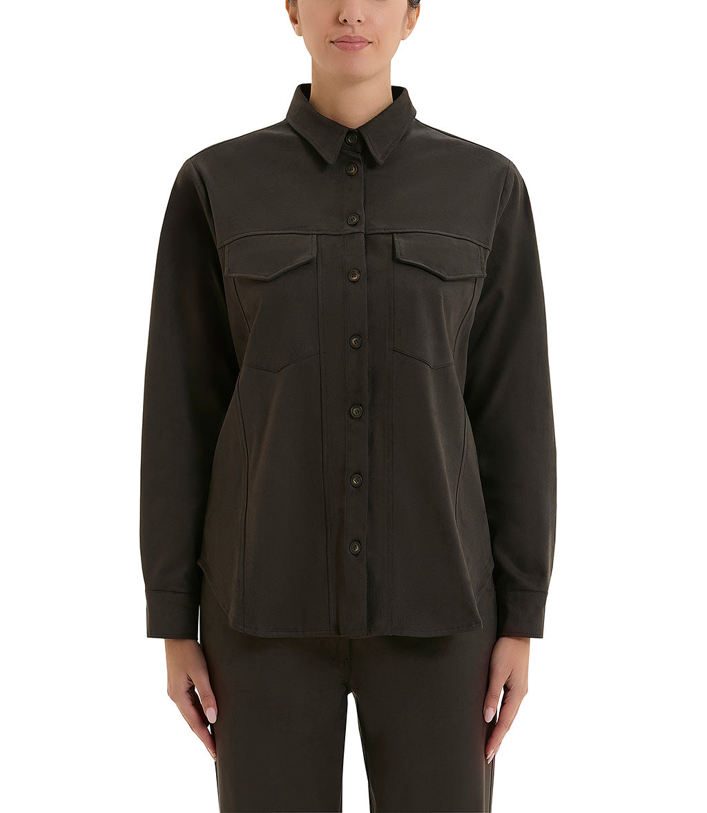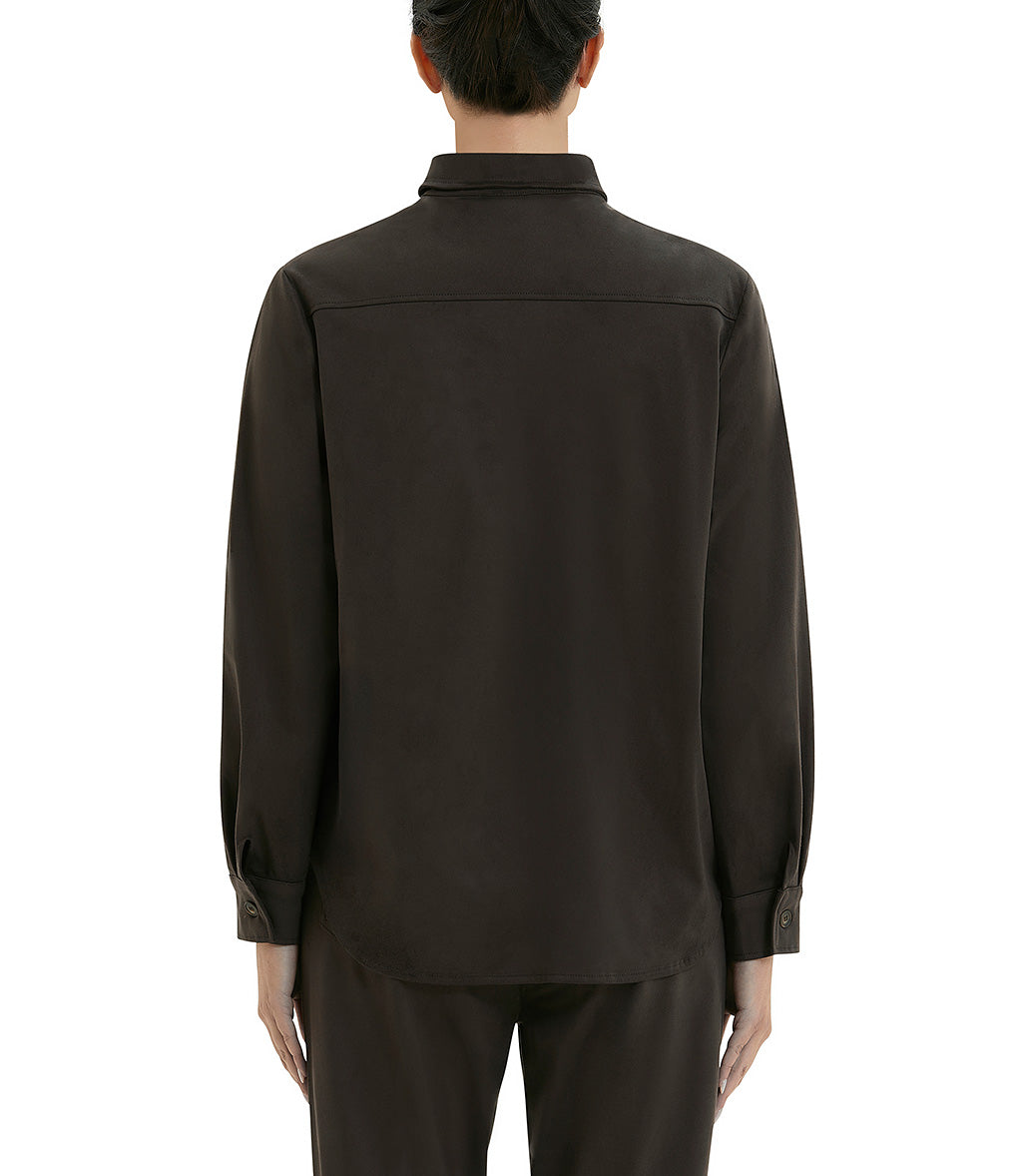 Chocolat-colored polyester suede effect long sleeve shirt. It features a classic collar with stand, rounded hem and flap pockets with flaps.