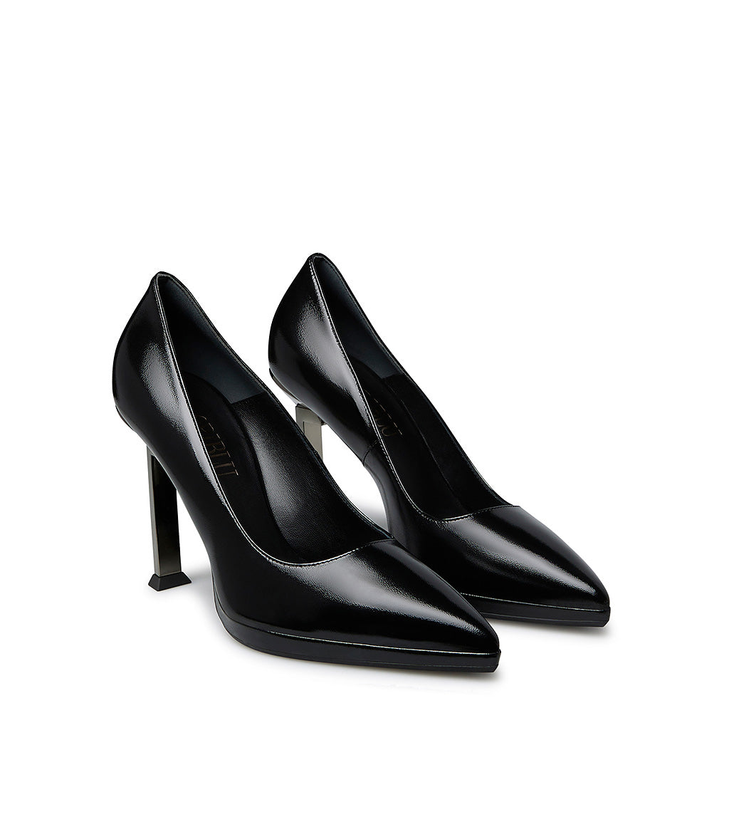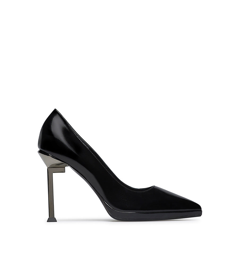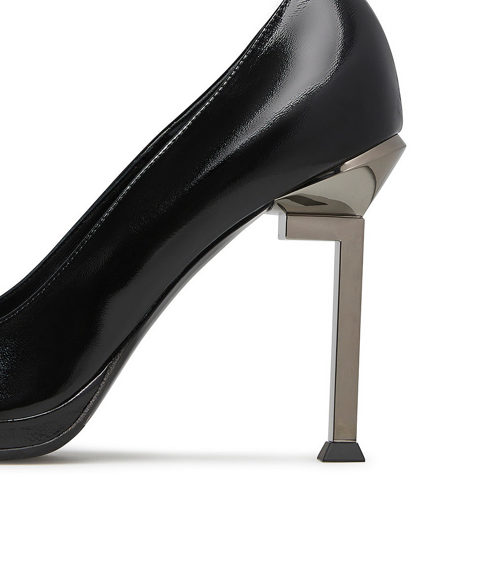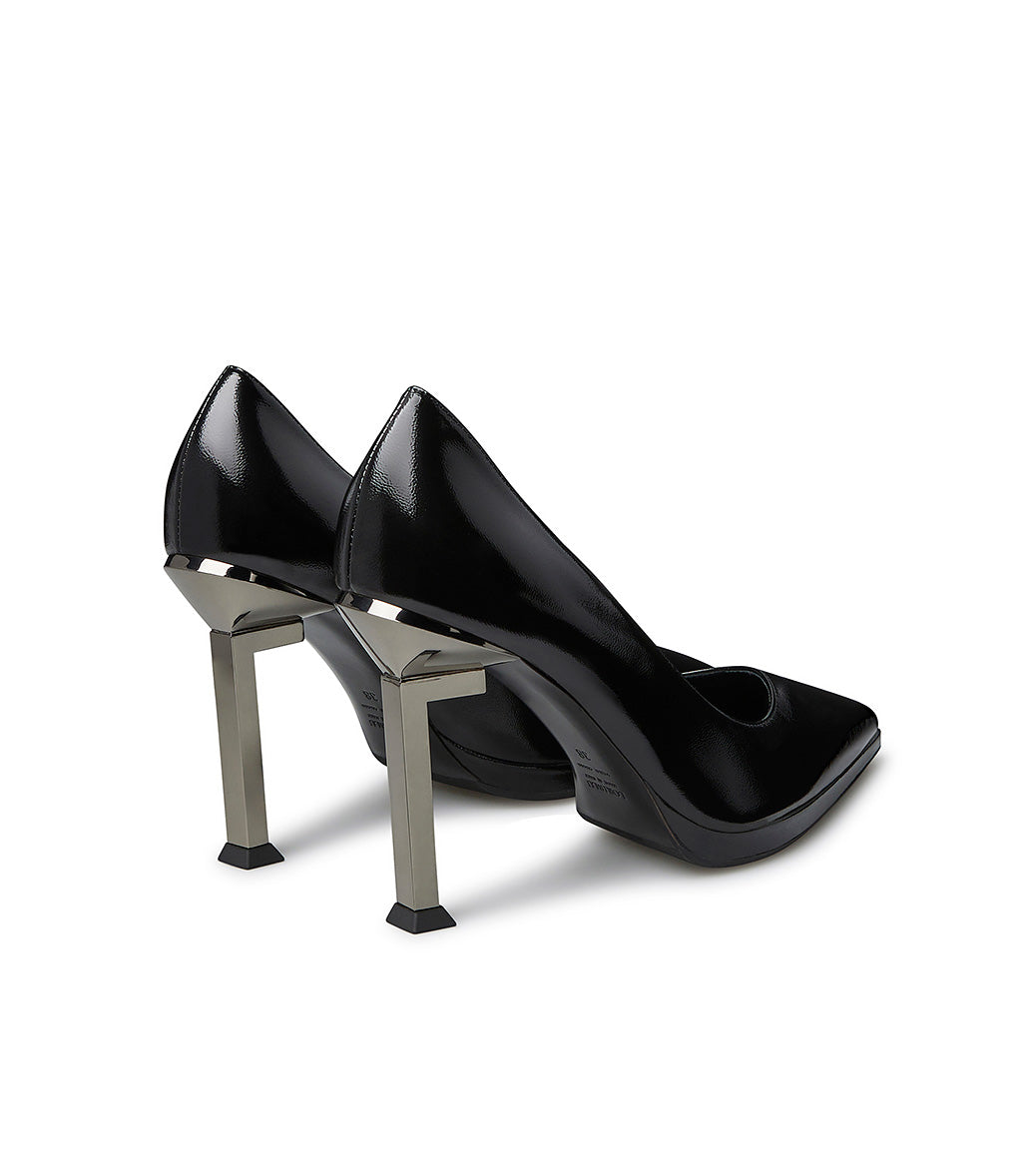 Seductive and elegant, the new Loriblu pumps. Elevated by a soaring L-shaped heel in gold metal, they feature a pointed toe with a mini platform and a glossy black leather upper. Wear them with an elegant outifts both day and evening.