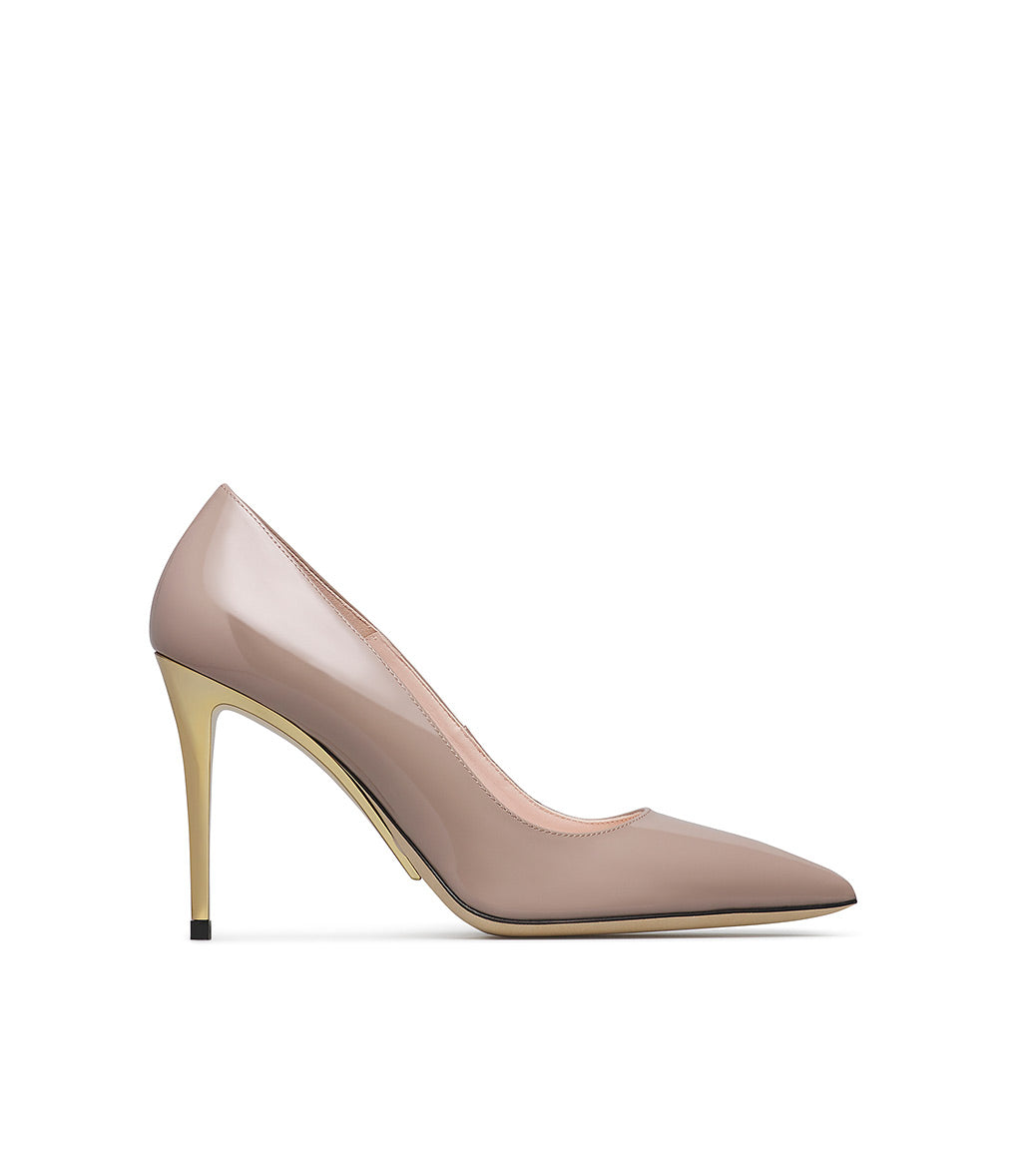 Made in Italy, our pumps are refined, feminine, and timeless. Crafted from premium patent leather in almond shade, they stand out thanks to their sculptural gold metal heel and refined silhouette. Featuring a pointed toe and natural leather sole, they're the perfect accessory to complement your elegant outfits.