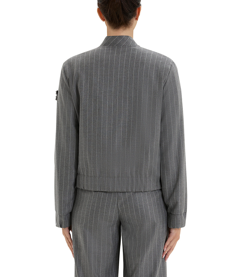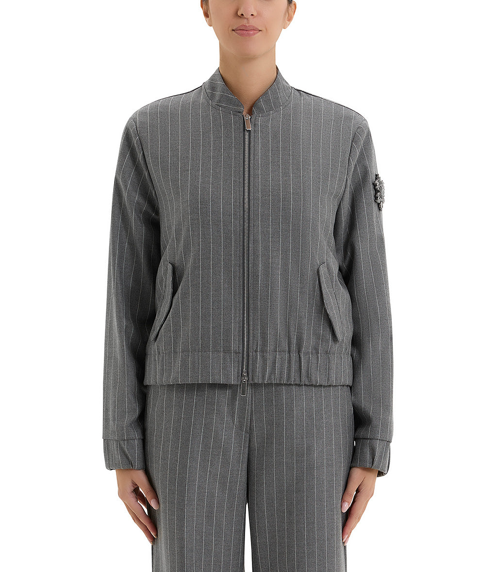 Grey pinstriped bomber jacket. Front metal zip closure, officer collar, and elasticated cuffs. It features slanted side pockets with flaps and elasticated hem. Jewel embellishment in flower shape on the left sleeve.