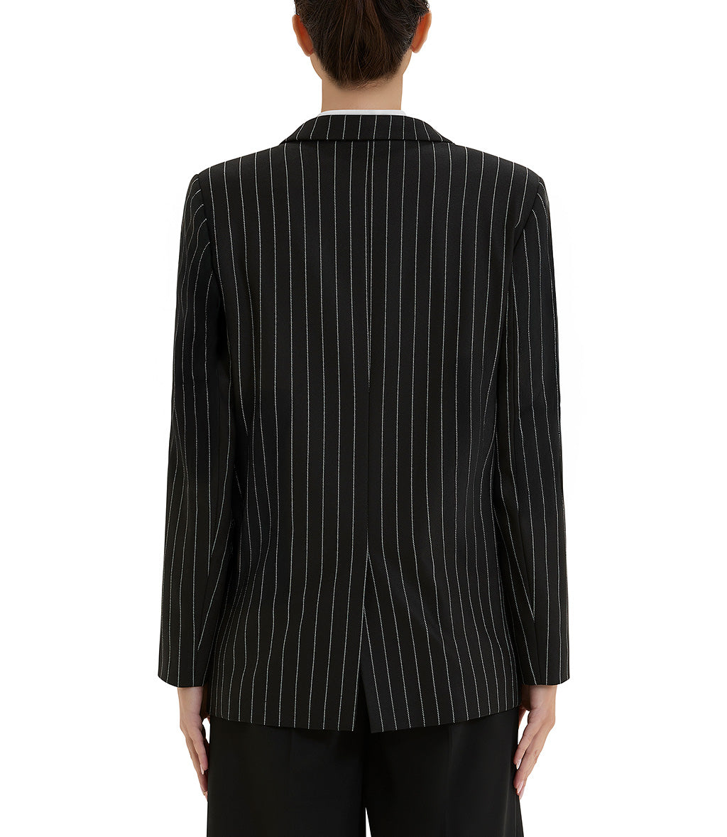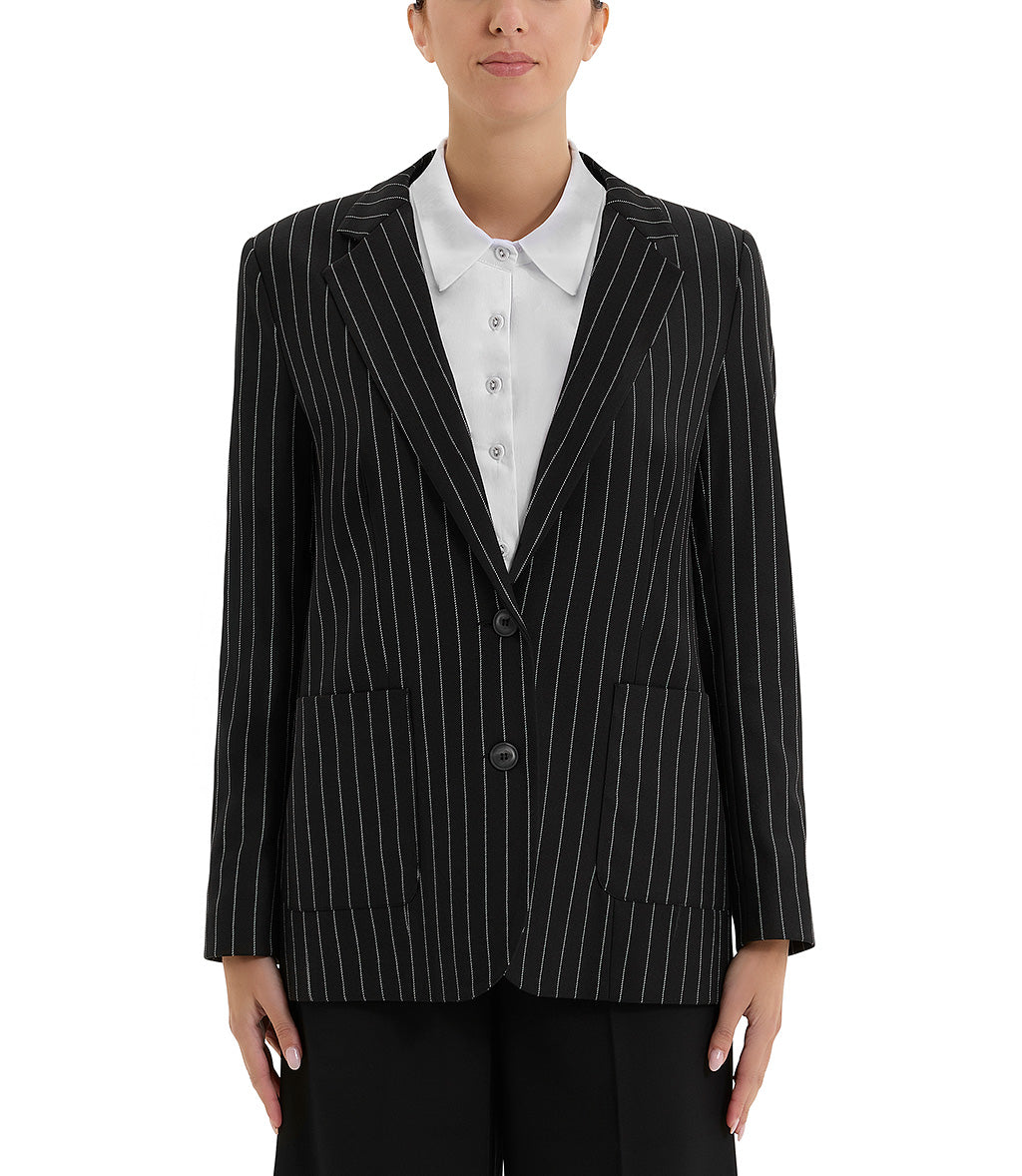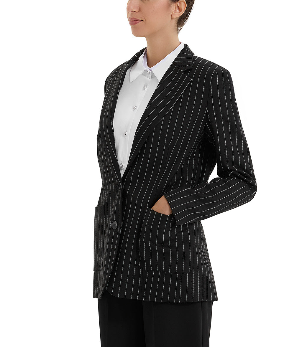 Black polyester pinstripe jacket with classic lapel and flap pockets on the front.