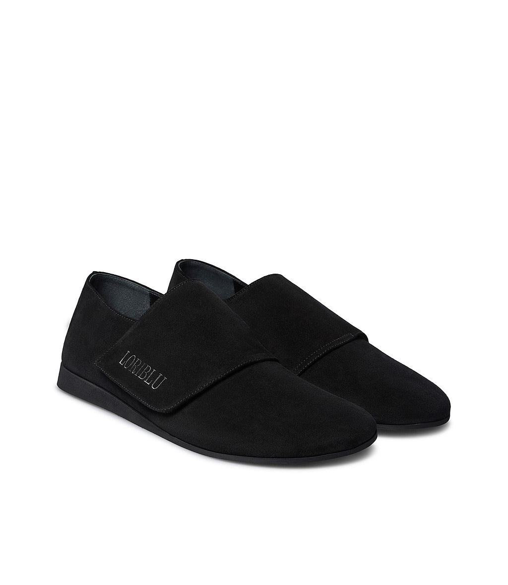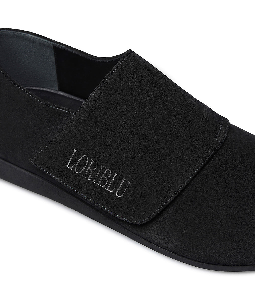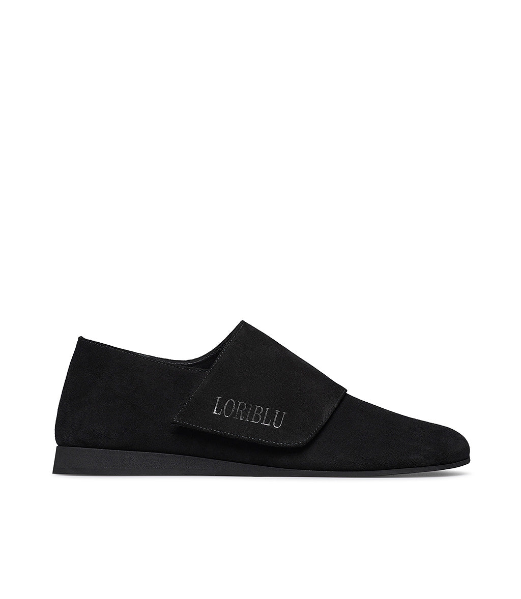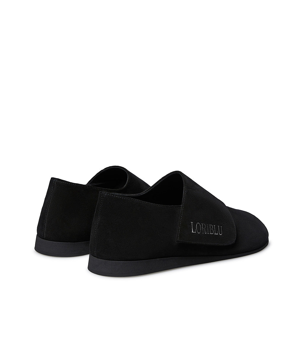 Black suede high-top loafer with a wide front band and side Velcro closure, internal wedge heel, and rubber outsole. The wide fit features this model with soft, ergonomic lines. Absolute comfort and versatility in a single style.