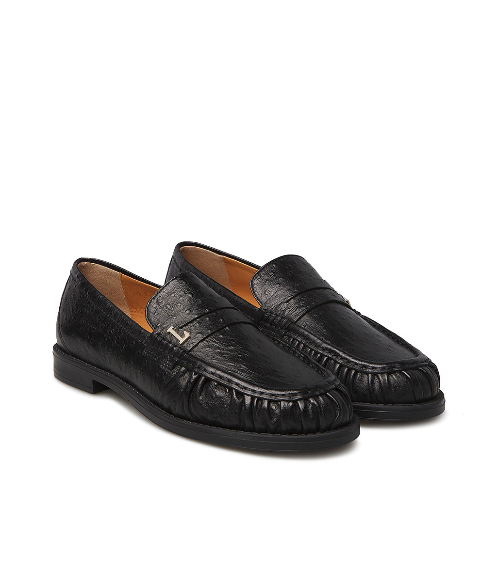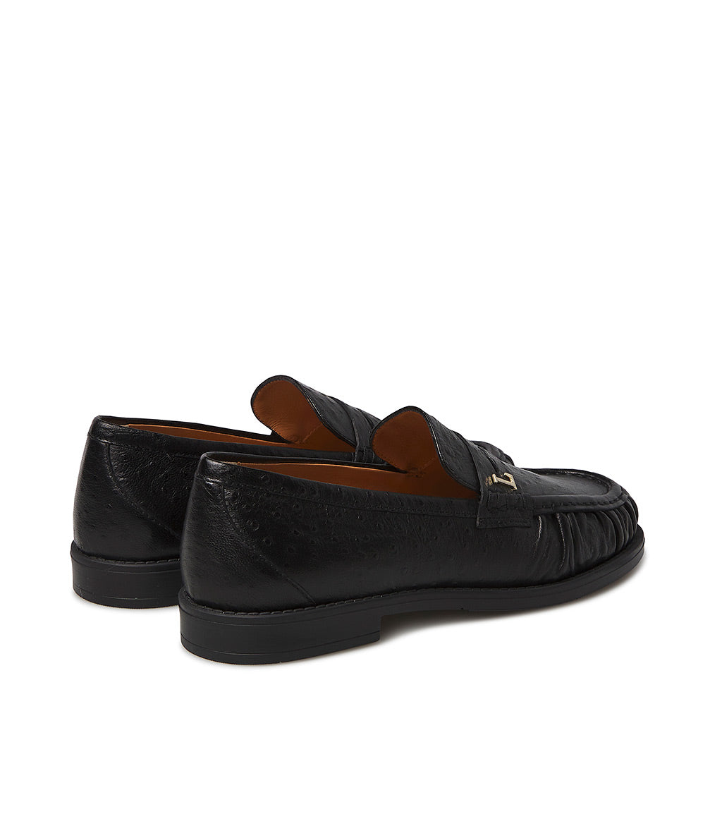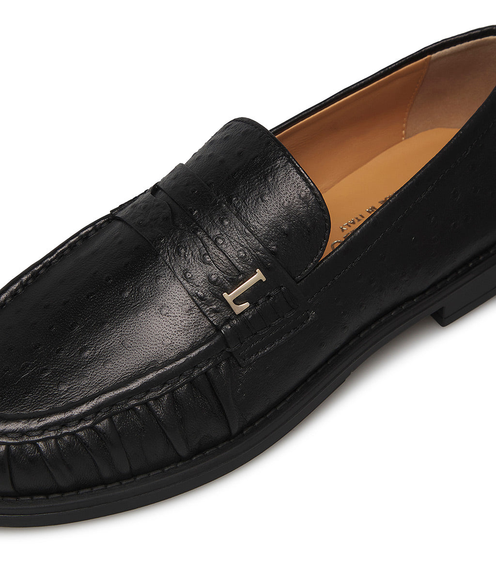 Crafted in Italy from premium black ostrich-print leather, our comfortable loafers feature a flawless, timeless silhouette. They sit on a leather sole and feature a rounded toe with a gathered shape accented by raised stitching. Ideal for everyday wear.
