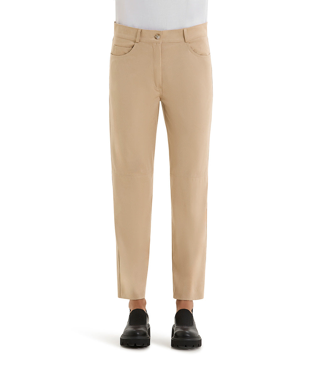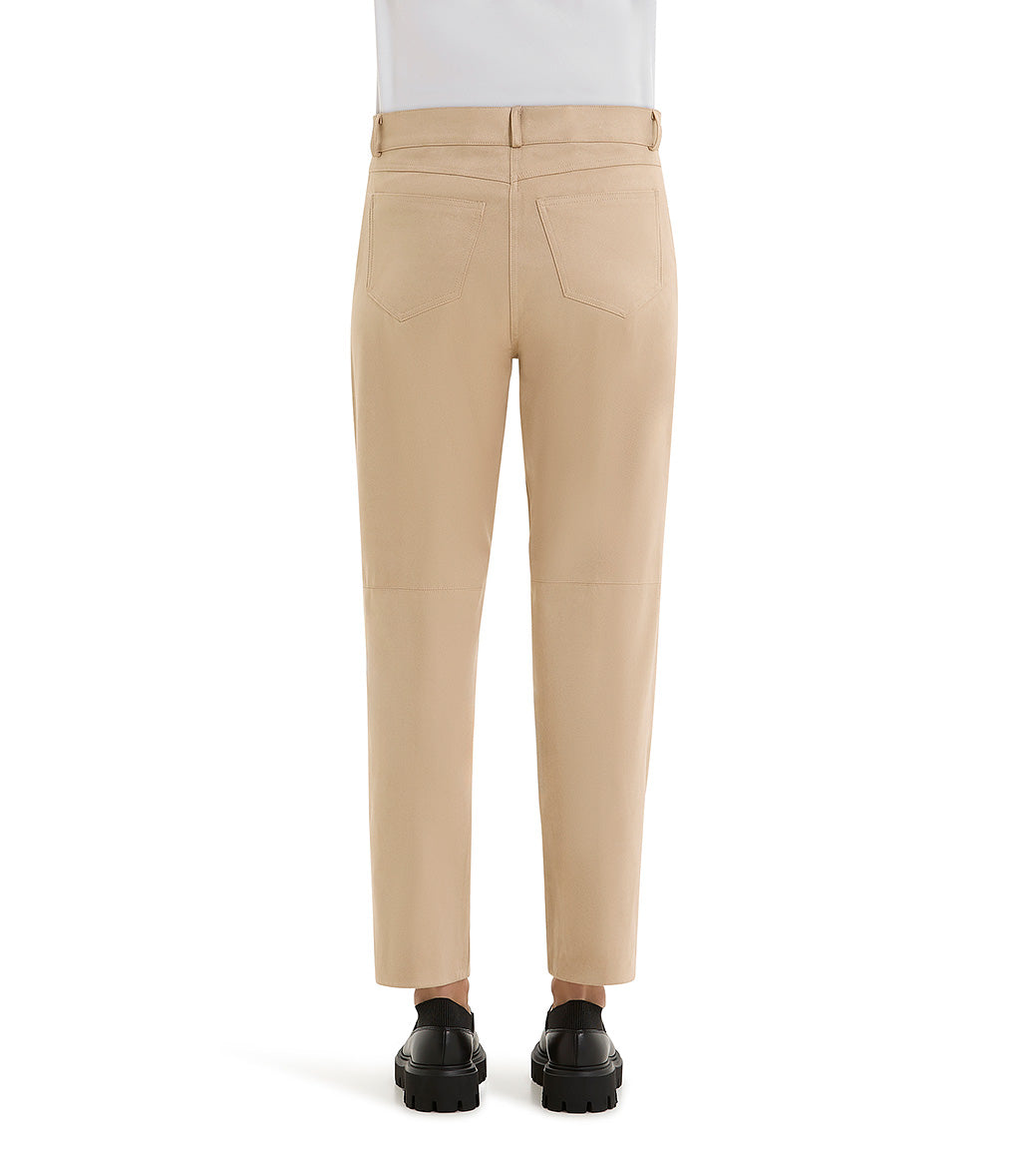 Desert color polyester suede effect long trousers with a straight fit, featuring five classic pockets and a stylish cut at the knee.