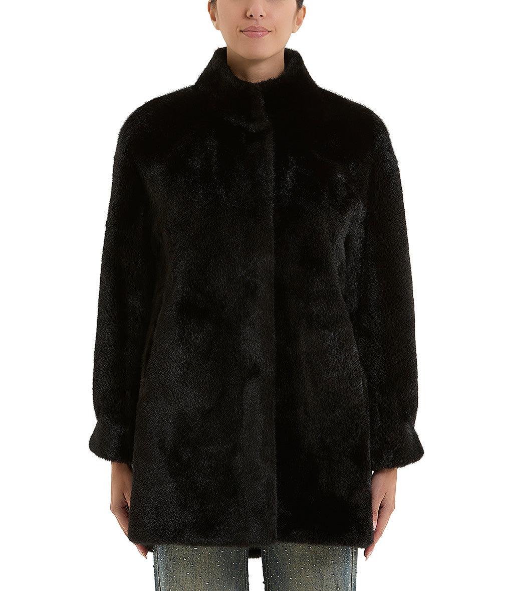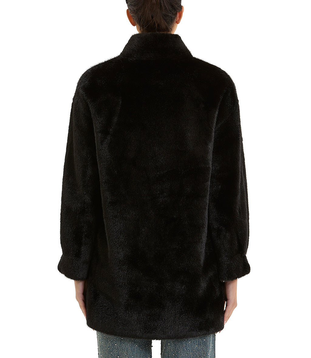 Black polyester long unlined fur with long sleeves. It features a front-center clip closure and diagonal welt pockets.