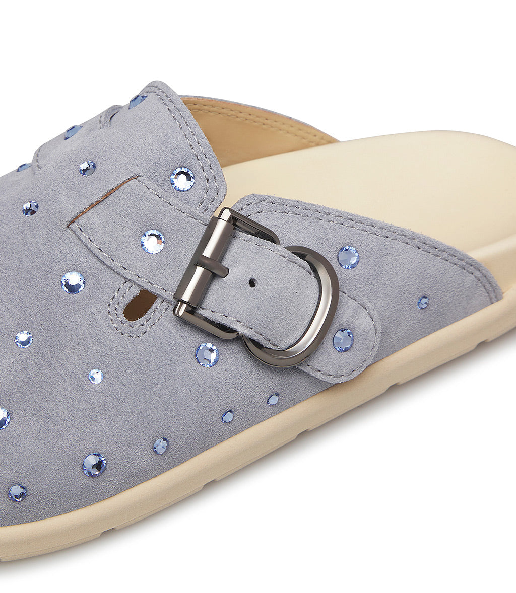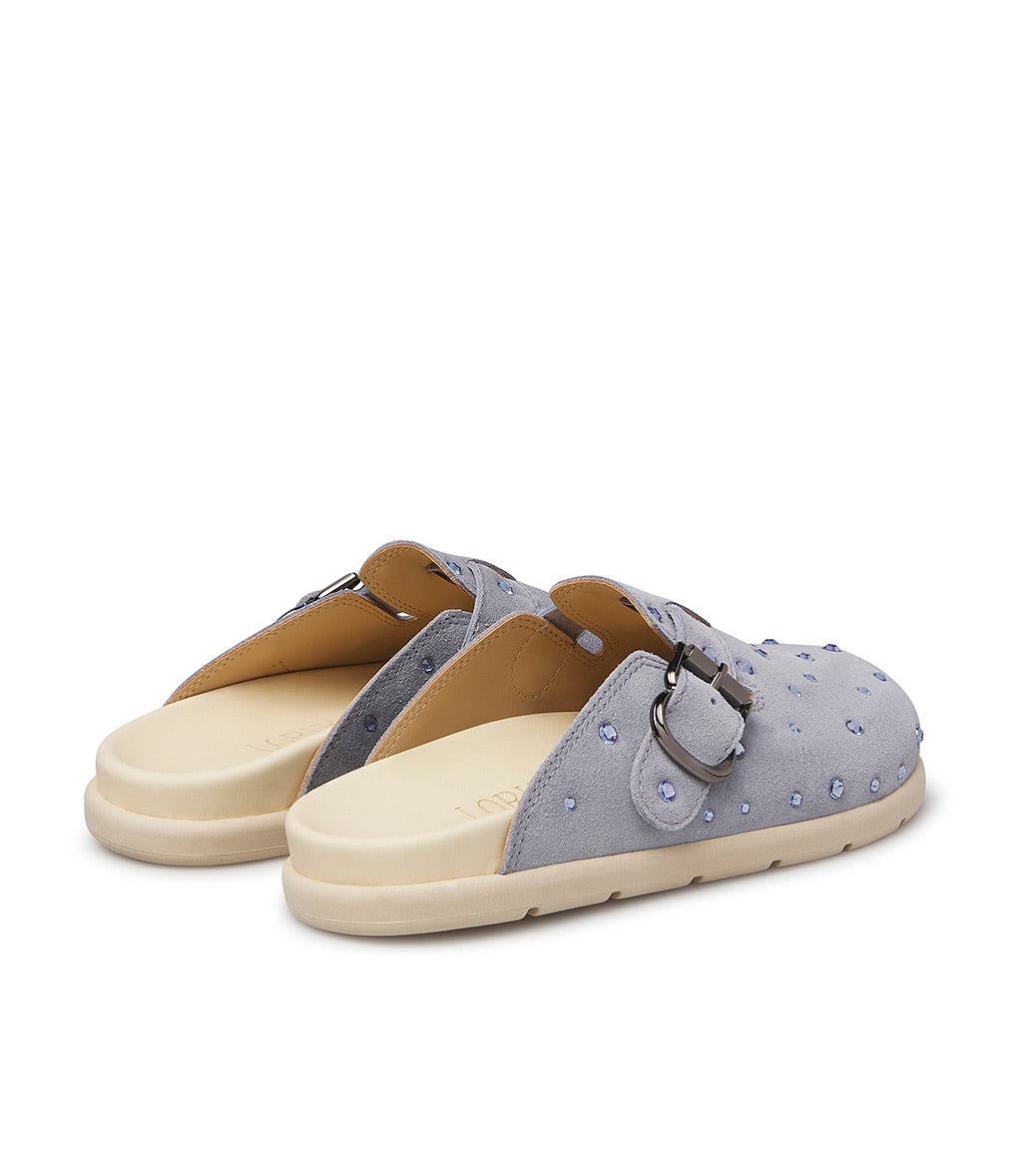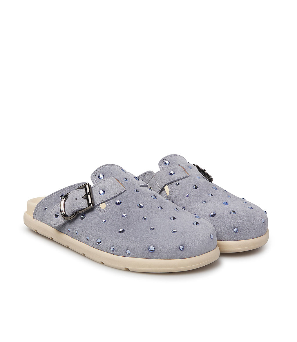 A cool alternative to classic sneakers, our aviator blue suede slippers feature a comfortable, ergonomic design embellished with crystals and a strap with a silver-tone metal buckle. They're meticulously crafted in Italy and feature a rounded toe and a sporty white rubber sole.