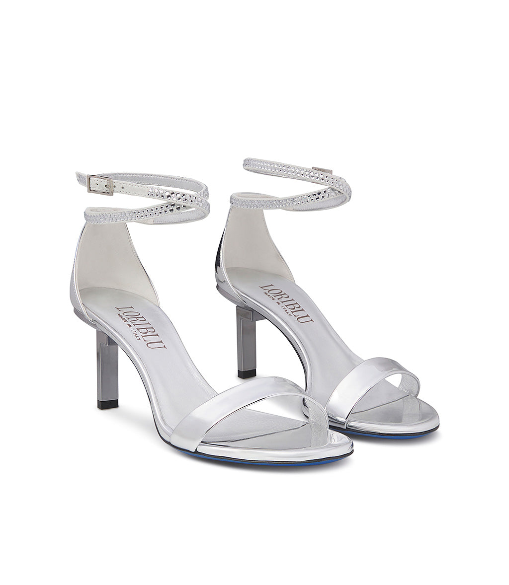 Elegance and glamour blend seamlessly in our premium silver-toned patent leather sandals from the new collection. Crafted in Italy, they feature our signature inverted L-shaped heel, slim ankle straps embellished with tone on tone crystals, and the iconic blue leather sole. Wear them with your daily or evening most chic outfits.