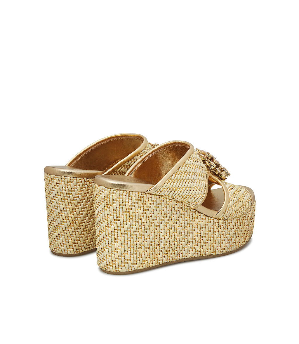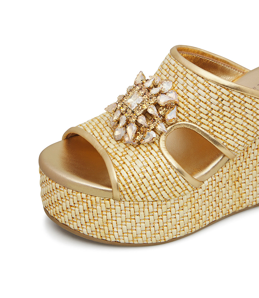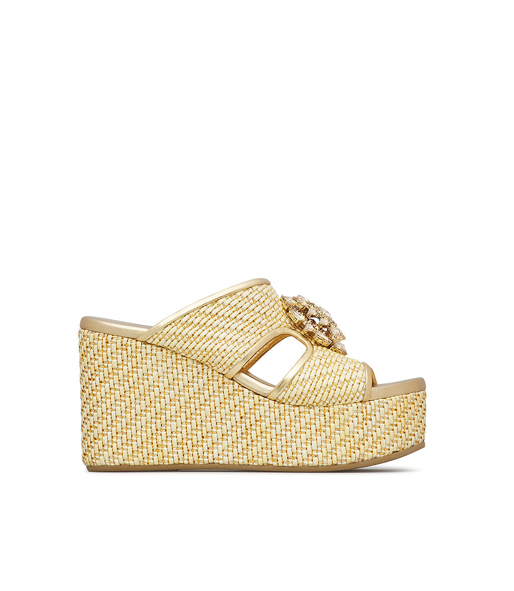 Sandalo zeppa in raffia e vernice oro con gioiello