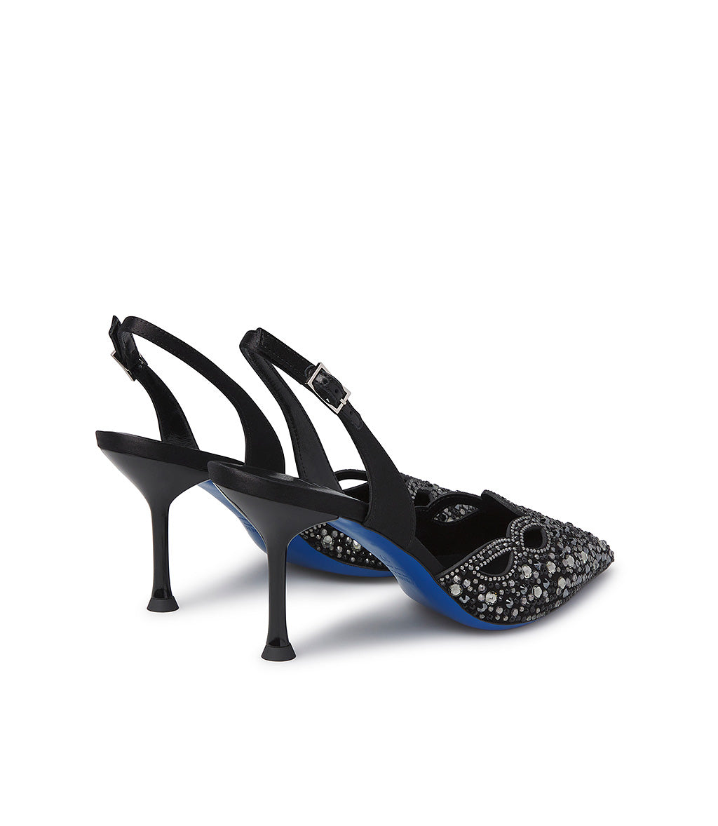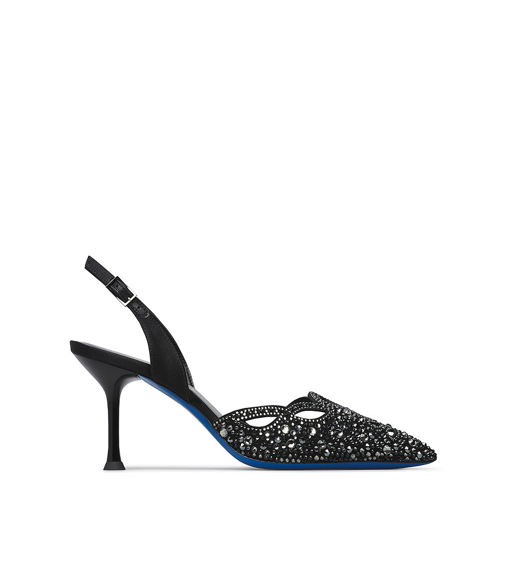 Glamorous and exquisitely refined, our jeweled slingbacks are perfect for completing your most special and exclusive formal outfits. Crafted in Italy from black suede with a cutout design and embellished with silver-toned gradient crystals, they feature a classic adjustable tobacco satin back strap, an iconic blue leather sole, and an elegant lacquered spool heel.