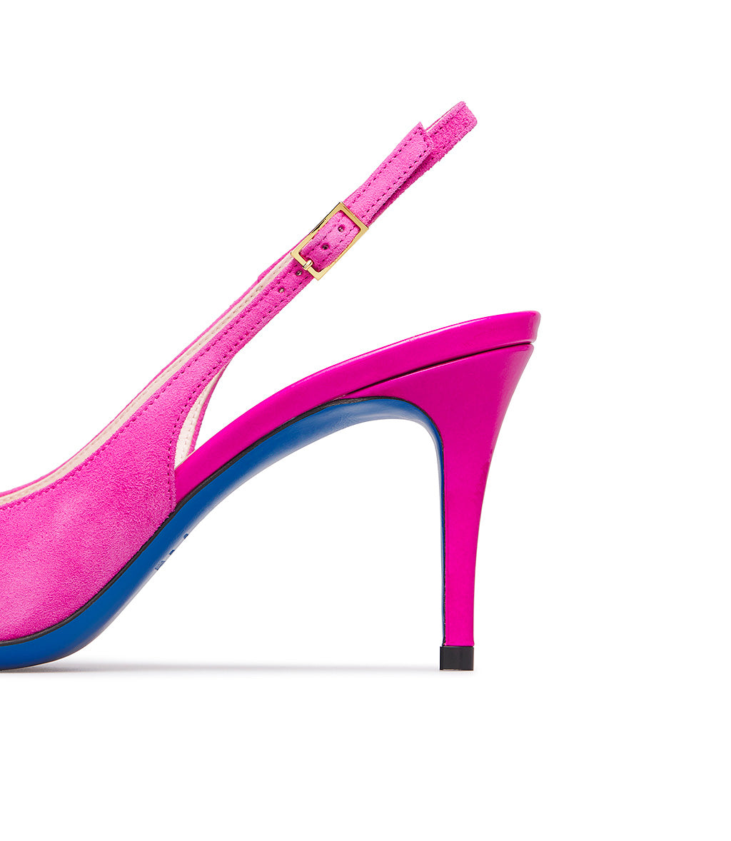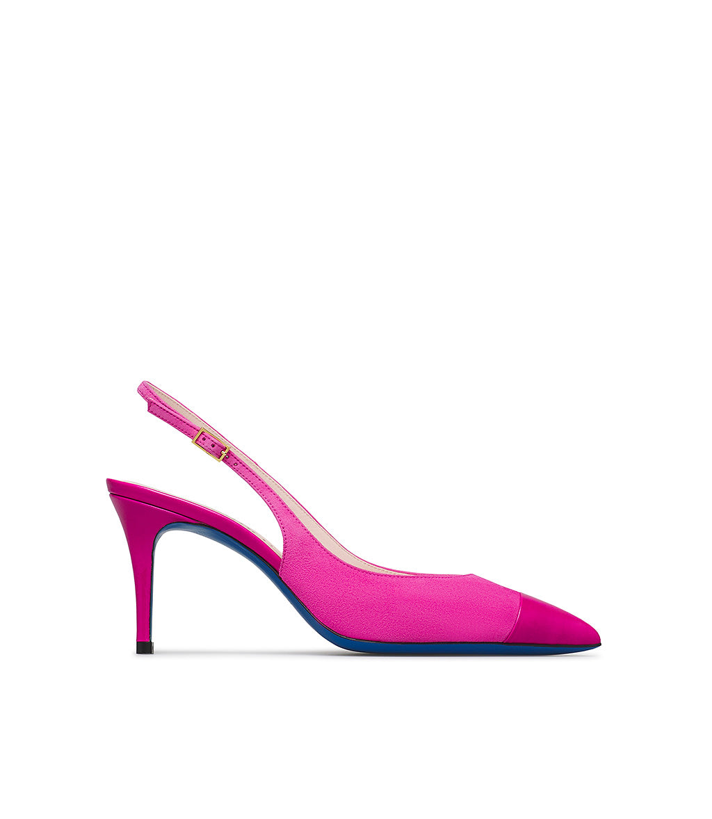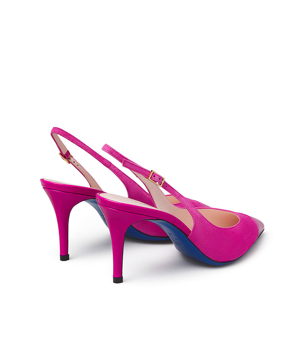 Elevated by an elegant stiletto heel, our slingbacks in premium fucshia suede with patent leather details enchant with their timeless elegance. The classic adjustable back strap and iconic blue leather sole complete the design. 100% Made in Italy.