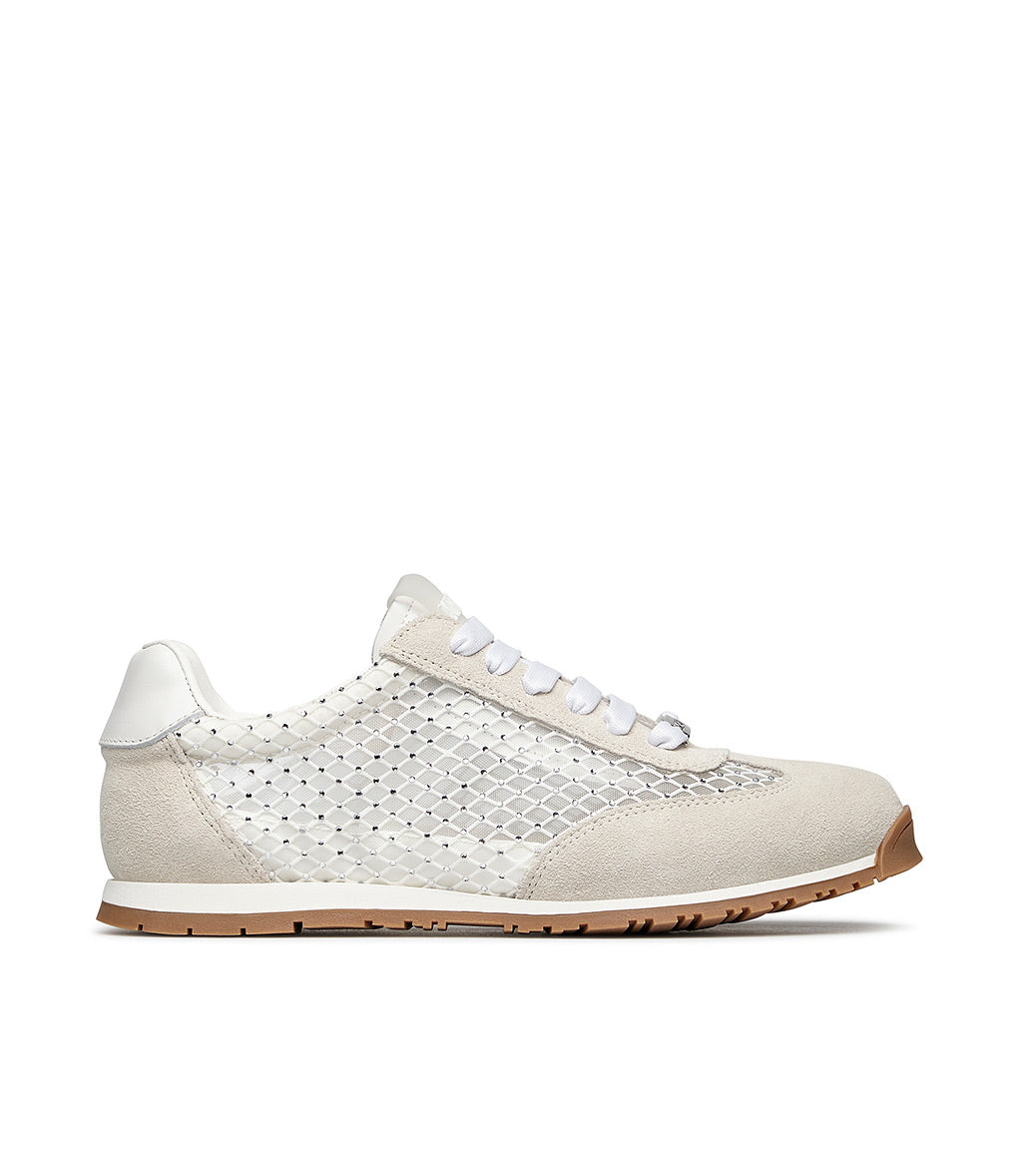 Sporty-chic style for our new collection sneakers. Crafted in Italy from premium cream tone suede, they stand out for the sparkle of tone-on-tone microcrystals on delicate mesh inserts. Black satin front laces with metal logo. The contrasting white chunky rubber sole perfectly complements the design.